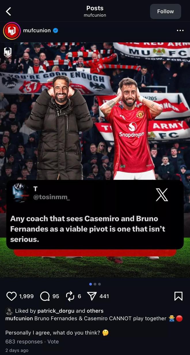 阿莫林的战术,本周似乎遭到了他自己引进的一名球员的质疑。年初3000万欧元加盟的左后卫帕特里克·多古竟在社媒点赞了一段炮轰曼联主帅同时让卡塞米罗和布鲁诺·费尔南德斯首发的评论。