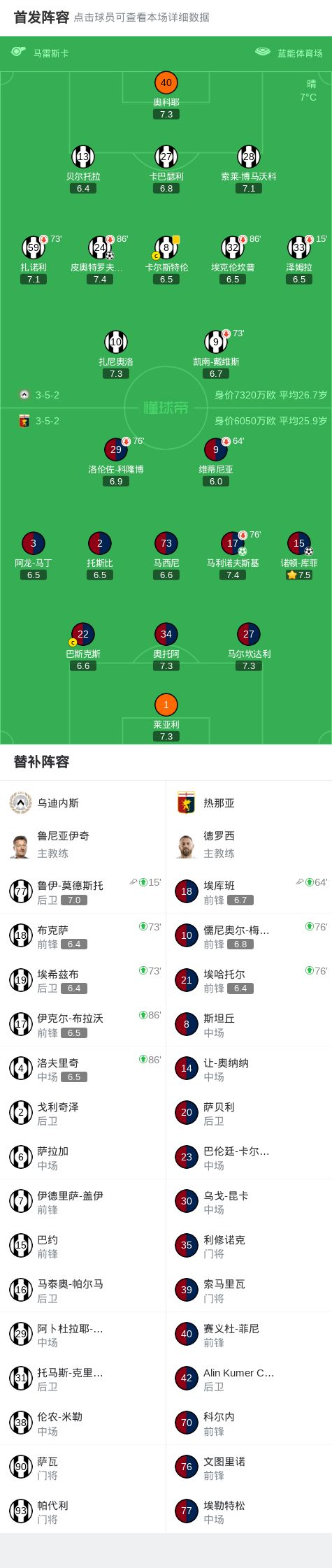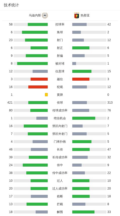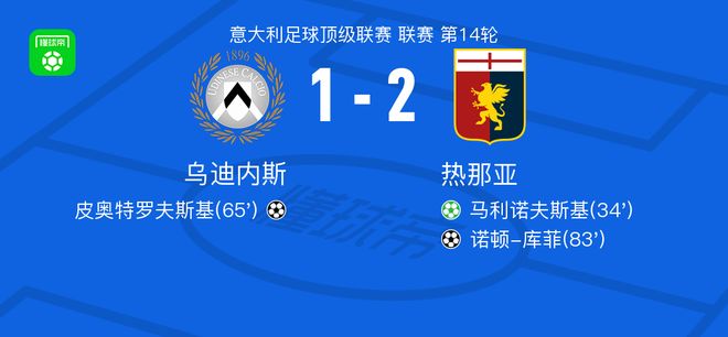 北京时间12月9日意大利足球顶级联赛 联赛 第14轮,乌迪内斯主场对阵热那亚。乌迪内斯皮奥特罗夫斯基破门。热那亚马利诺夫斯基破门,诺顿-库菲破门。最终比分乌迪内斯 1-2 热那亚。