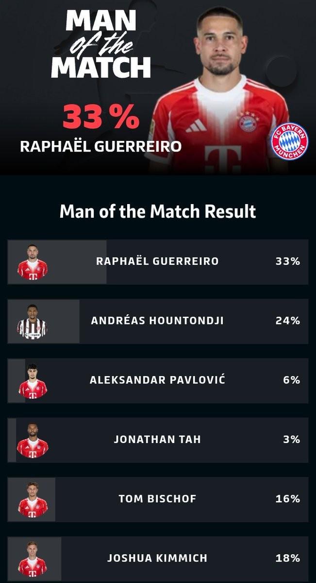 打进一球,格雷罗当选拜仁vs圣保利全场最佳球员